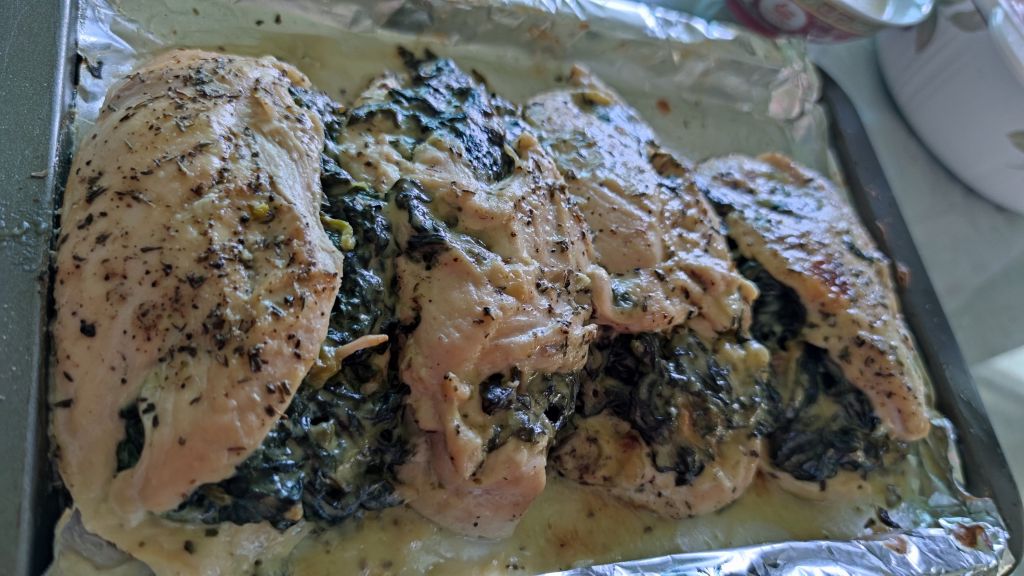 This week I tried one new recipe that I wanted to try for awhile. Spinach and cheese stuffed chicken. Normally the recipe also called for articoke hearts, but I didn’t have any on hand and there were none that the vegetable market close to my house, so I just made due without. Another issue that I ran into is that I adjusted the recipe for 6 portions, but I only defrosted 2 bags of chicken breasts, which contained 4 chicken breasts. I was just assuming the Costco chicken boneless, skinless chicken breasts contained 3 / pack like the chicken thigs, but that’s not the case. You live, you learn. See recipe for that below and nutrition info as well.