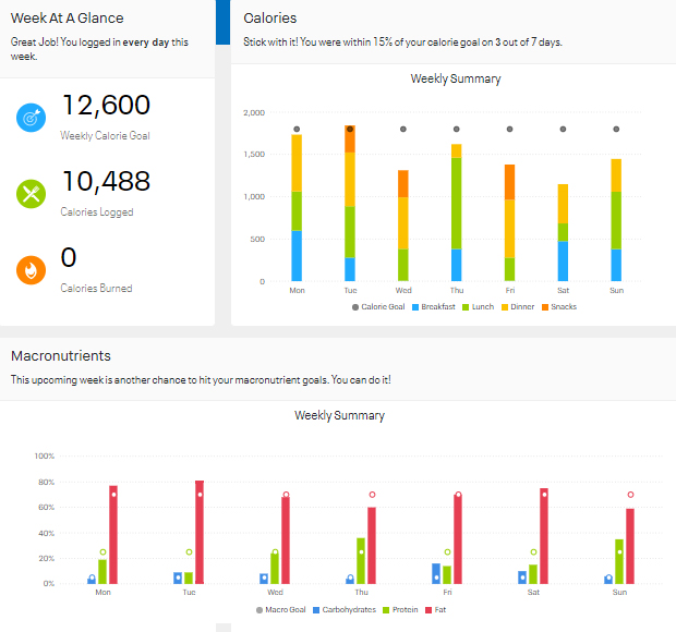 I was well below my calorie goal overall, under by 2K calories, and only on Tuesday did I exceed the individual calorie target. As for carbs, this was a good week where I was within my daily carb limits.